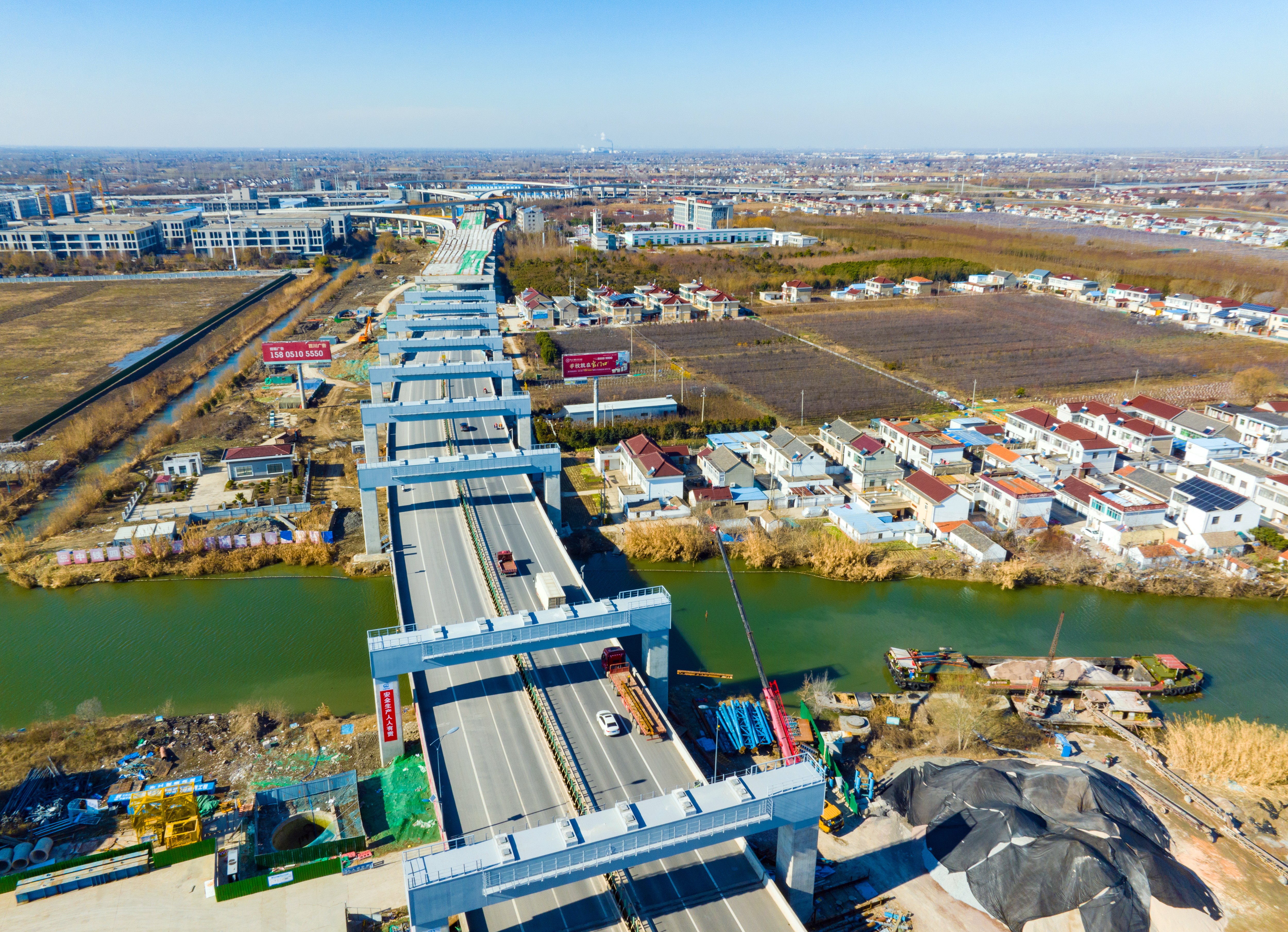 全线设计为主6辅6高架式快速路,自G204交叉口东起桥,沿新业路线位布置,与锦城路设一对定向匝道衔接,主线连续跨越锦城路、串场河、人民北路、开放大道,终点设一对向南的定向匝道与范公路主线衔接,路线总里程约3.62公里,分别于人民北路东、开放大道西设置一对上下匝道。项目预计今年2024年10月实现全面通车。