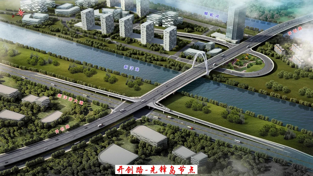 项目采用双向六车道城市主干路形式,全长约4.87km,起点位于新景路北段,以高架形式上跨新景路、皮岔河、规划政通路、盐兴路、新洋港、先锋岛、蟒蛇河,终点接入蟒蛇河南侧现状开创路,与新建康庄大道辅道设置平面交叉,在盐兴路和先锋岛内黄海路设置匝道供开创路车辆上下,全线共2座主线桥,2座辅道桥,6座匝道桥,及地面道路长约1.79km,高架桥路基工程已完成20%,目前跨88 138新洋港航道斜拉桥为全线重难点工程目前已完成下部结构施工。整体项目计划于2024年12月底完工。