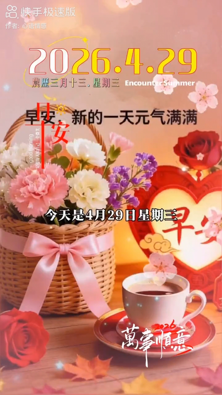 今天是4月22日,星期三,早安!家财万贯难买安,位高权重不如康。人这一生,最珍贵的从不是财富与地位,而是岁岁平安。愿你生活安稳,身体康健,家人皆安。不求事事圆满,但求事事顺心,所念皆喜乐,所想皆如意。