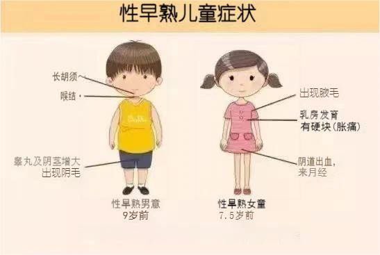 我国对于性早熟的定义是指(1)性征提前出现,即女童7.5岁前出现乳房发育或10.0岁前出现月经初潮,男童9.0岁前出现睾丸增大;(2)性腺增大,即盆腔B超示女童子宫、卵巢容积增大且卵巢内可见多个直径≥4 mm的卵泡,男童睾丸容积≥4 ml;(3)血清促性腺激素及性激素达青春期水平;(4)多有骨龄提前,骨龄超过实际年龄≥1岁;可能影响孩子的成年身高,也会影响着孩子的心理发育,需要及时就诊,在医生指导下进行规范治疗。