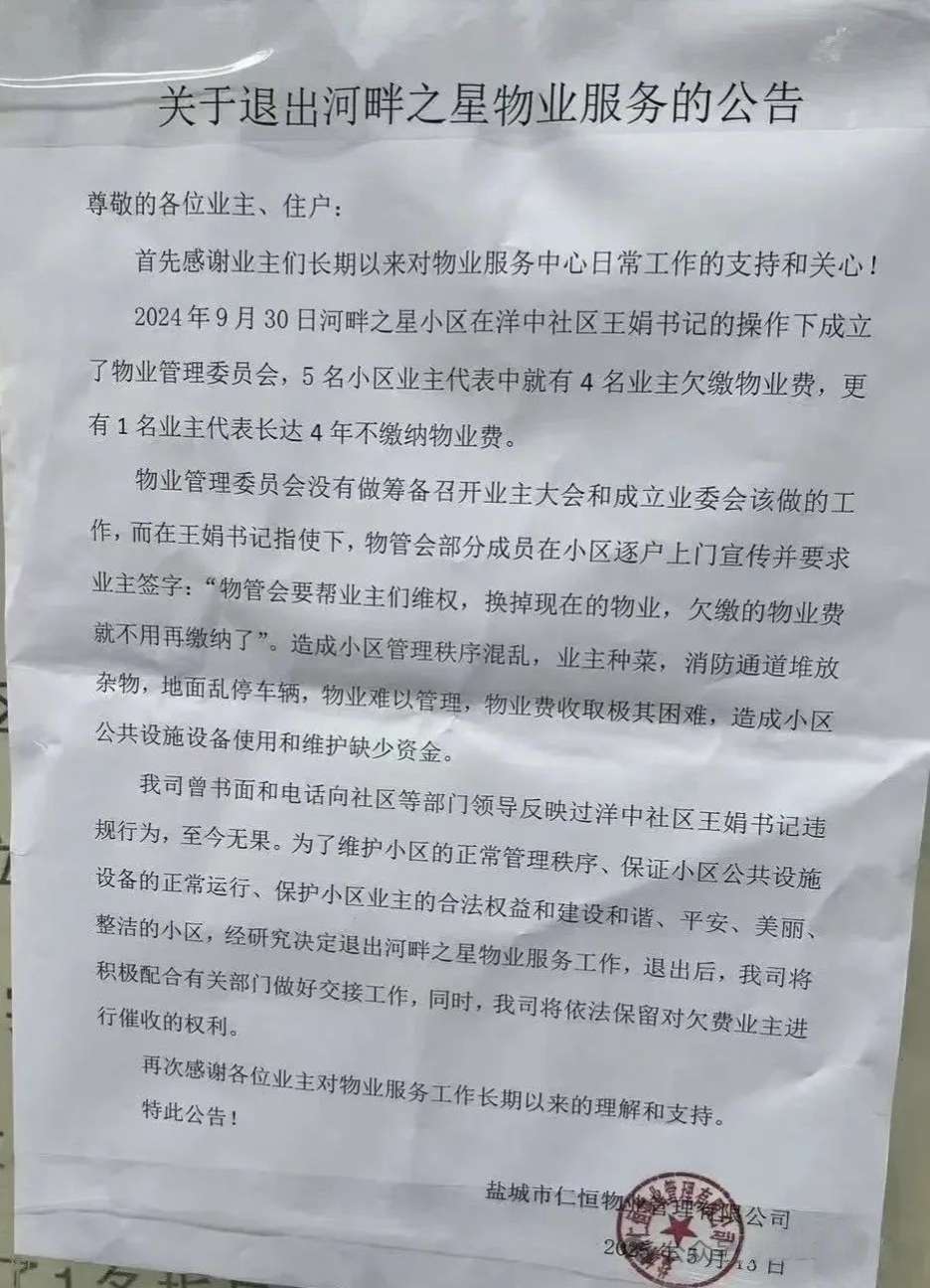 尊敬的各位业主、住户:首先感谢业主们长期以来对物业服务中心日常工作的支持和关心!2024年9月30日河畔之星小区在洋中社区王*书记的操作下成立了物业管理委员会,5名小区业主代表中就有4名业主欠缴物业费,更有1名业主代表长达4年不缴纳物业费。物业管理委员会没有做筹备召开业主大会和成立业委会该做的工作,而在王*书记指使下,物管会部分成员在小区逐户上门宣传并要求业主签字:“物管会要帮业主们维权,换掉现在的物业,欠缴的物业费就不用再缴纳了”。造成小区管理秩序混乱,业主种菜,消防通道堆放杂物,地面乱停车辆,物业难以管理,物业费收取极其困难,造成小区公共设施设备使用和维护缺少资金。我司曾书面和电话向社区等部门领导反映过洋中社区王*书记违规行为,至今无果。为了维护小区的正常管理秩序、保证小区公共设施设备的正常运行、保护小区业主的合法权益和建设和谐、平安、美丽、整洁的小区,经研究决定退出河畔之星物业服务工作,退出后,我司将积极配合有关部门做好交接工作,同时,我司将依法保留对欠费业主进行催收的权利。再次感谢各位业主对物业服务工作长期以来的理解和支持。