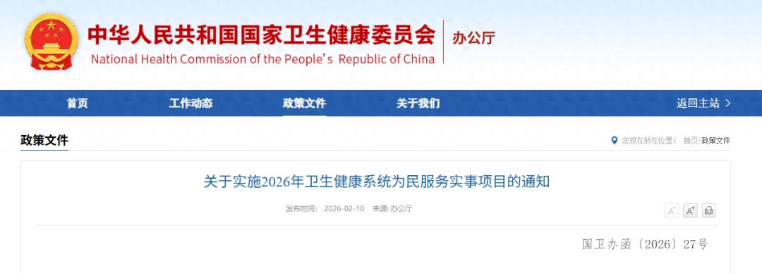 为深入贯彻落实党的二十届四中全会和中央经济工作会议精神,巩固拓展2025年卫生健康系统为民服务实事成效,持续改进和提升卫生健康服务水平,更好解决群众急难愁盼健康问题,国家卫生健康委、国家中医药局、国家疾控局决定2026年继续在全国卫生健康系统组织实施一批为民服务实事项目。现将有关事项通知如下: