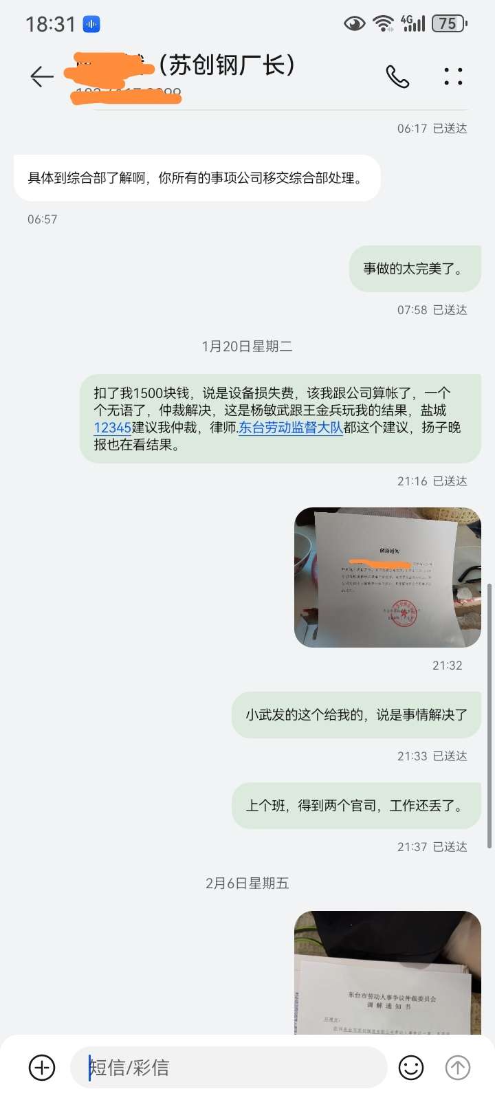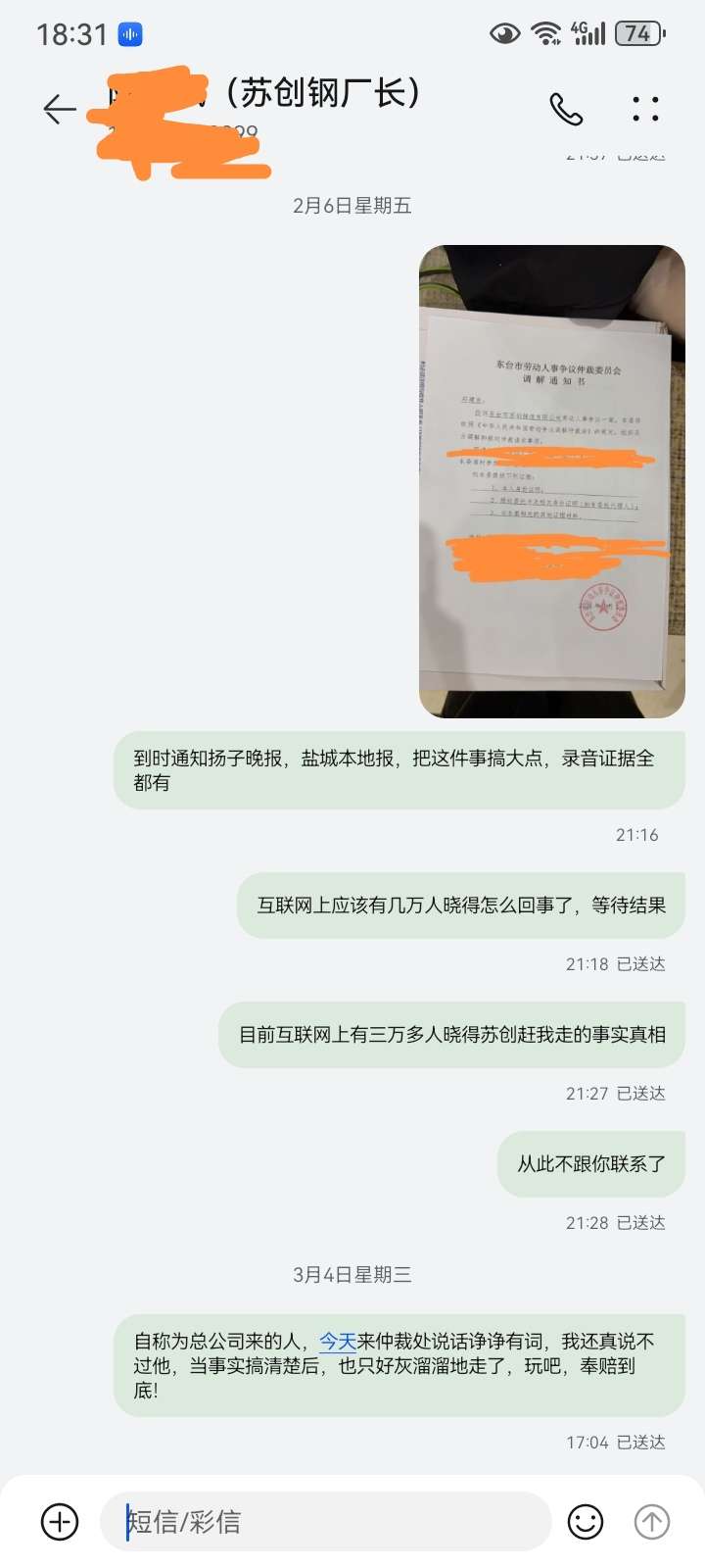 东台时堰苏创公司年前单方面非法开除电工一事,26年3月4号东台仲裁庭上,苏创派出总公司一名代表和苏创公司处理该事情的两个负责人到庭。被开除的电工和律师代表到庭。那个自称为总公司的代表拿着复印过的事故报告单对电工说,这件事还没解决好,还没结束,这个事情要先解决好。电工说,这件事己经解决好了,你竞然说没解决好,那就跟你再打个官司,苏创那两个知道真相的代表默不作声。开庭,苏创总公司代表抢着发言,拿着己经了结的事故报告单说,先把这个事情解决了,再谈赔偿的事,赔偿也只能赔偿一个月六千块钱和解决申请失业金的事,说这是苏创老板的意思,当场招到电工的拒绝,并当庭掀破真相,另两个代表就差钻到桌子下面去了。电工当事人说,这个事故报告单是厂长出调度逼着写的,完全安照他俩的意思写的,有长达两个小时的录音证据可以证明,再说这件事已经解决了,26年1月3号发生的事,扣了25年12月的工资一千五百块钱,即然还提这件事,那这件事还得打个官司,并且把这件事告诉新闻媒体,扬子晚报,录音证据可以公开证明,这个事故报告单是怎样写成的,是不是非法的。电工当事人指着苏创公司的一个代表说,你问他,是不是他让我自动辞职,他会帮我办好失业保险金,被我拒绝了,这些都有录音证据,可以当庭放。这个总代表一听,哑了,三个人灰溜溜地走了苏创公司连总公司的代表都不敢说实话,在仲裁庭上闹出这种笑话,苏创老板更不会知道这起事情的真相,苏创老板好好查一查制造这件事情的主谋杨敏和王金兵。是不是有人买通他们的。买通之人己经触犯的刑法,此事很快会真相大白,不然不可能连厂长.调度.人事一帮人都用心用计把电工赶走。买通之人跟电工是亲戚关系,正在因房屋装修的事闹矛盾。苏创人事部那个劝电工辞职的人也说,电工正在打官司,电工本人都没确定的事,人事部的人怎么会知道的。总之,苏创即然己经赶人家走了,就得承担一切后果,恶意拖延.逃避责任,只会让苏创口碑彻底崩盘,招工.合作无人敢信。此事会维权到底,绝不妥协,仲裁裁决,媒体曝光,法律追责,同步推进,直到拿回合法权益。
